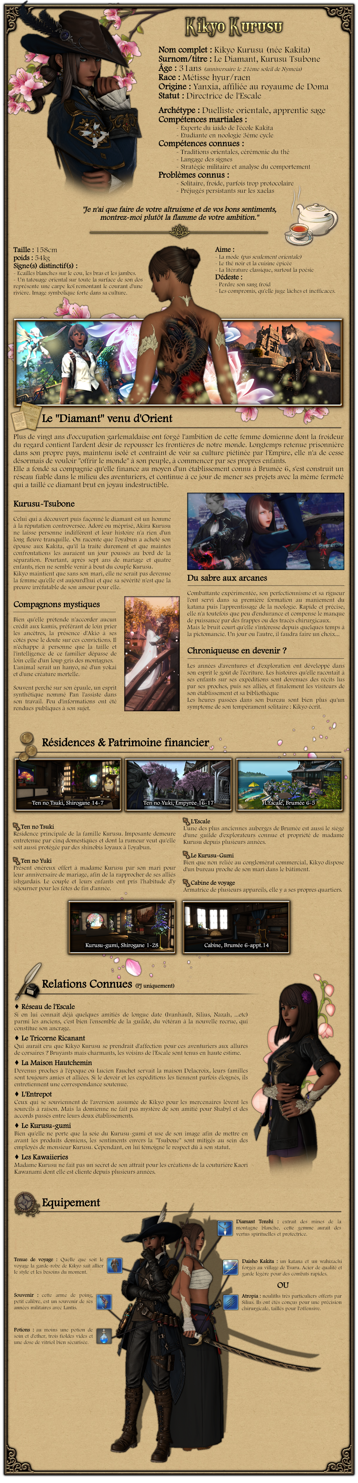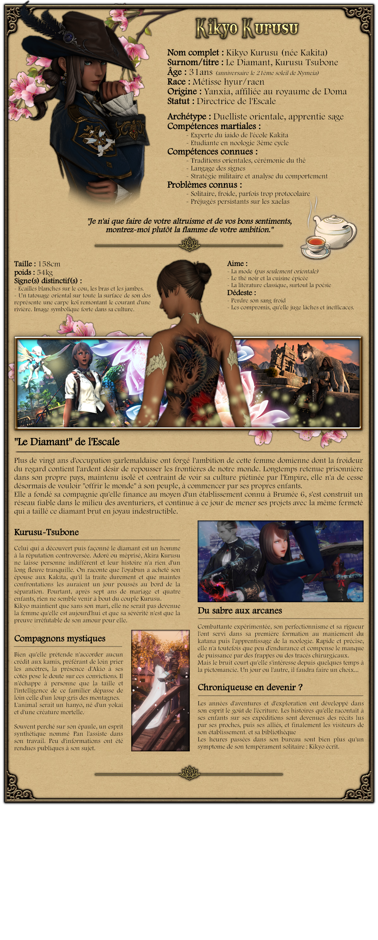 Cette bataille, et le fait que j'y ai survécu, me légitima plus ou moins auprès des Kakita. Ce fut moins pour la parole de mon demi-frère que par nécessité. De tous les samourais portant l'emblème de Tsuru nous n'étions plus que quatre. Pour reconstruire le clan et sauver les apparences d'une noblesse en déclin, même une bâtarde avait son utilité. Jusqu'ici, j'avais obtenu le droit d'intégrer le dojo et de me perfectionner au iaido. Sous la tutelle de Kyo-sensei j'ai acquis la maîtrise du Tsuru-no-ken et Sanjuro-niisama me fit cadeau d'une lame forgée par nos ancêtres. J'étais fière. Je pensais trouver mon bonheur dans son ombre, en tant que sœur, même s'il m'était interdit de me présenter comme telle en public ou même d'apparaître devant les invités. Je me disais que c'était mieux que rien, que j'honorais mon père en silence. On finit par me confier une mission diplomatique. Sans doute Minako-dono avait insisté en ma faveur. Une fois les cendres de la bataille retombée, je fus envoyée en Eorzea rejoindre mon frère occupé à chercher des habitants de Tsuru au Glas des Revenants. En chemin, je devais rencontrer les chefs de tous les groupes ayant contribué à notre victoire afin de leur transmettre la reconnaissance de mon clan. Cela incluait de me rendre au Thanalan, me présenter à ce mercenaire dont le bras avait attiré mon regard : Akira Kurusu.