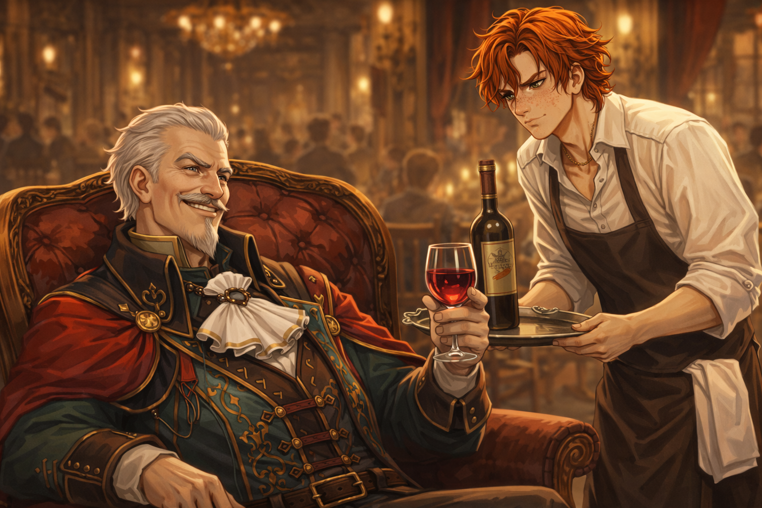 En attendant de rencontrer ce mécène, nous tâchons de nous préparer au mieux. Gretta nous a confié désirer vivre sa première -et probablement dernière dû à son grand âge- grande aventure, aventure avec un grand A. Je confesse me prendre d'une profonde et sincère affection pour elle au point de l'appeler grand-mère naturellement. Lothar et moi nous nous comprenons plus que je ne le laisse paraître, dans un autre monde je lui dirais sans honte ce que je suis mais je ne le peux pas encore. Surtout à cause de Pépin ; avec lui c'est compliqué. C'est un gentil garçon et, bien qu'il soit l'image de tout ce que je peux mépriser d'un ambrien, croyez-le ou non lui m'est sympathique. Il veut sauver son mentor, un homme qui est un second père pour lui. Je ferais de même pour vous, alors je le comprends. De plus c'est un garçon travailleur qui n'a pas hésité à accepter un emploi de serveur loin de sa condition de capitaine pour faire sa part dans notre besoin d'argent.