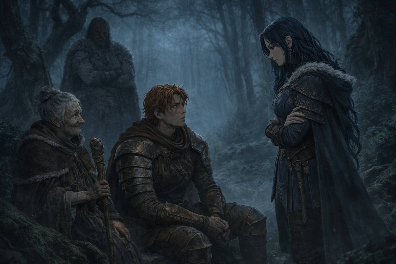 La journée touchait à sa fin, et de lourds nuages noir s'amoncelaient au-dessus de la campagne ambrienne. L'orage a éclaté peu de temps après que nous soyons entrés dans l'étroite masure de notre hôte. Il laissa son lit dans l'unique chambre pour grand-mère Gretta, et nous dûmes nous serrer un peu autour du foyer sur des paillasses de fortune. Mais au moins, tandis que la pluie balayait le toit et les fenêtres, que le vent hurlait dans les combles, nous étions au sec. Là, nous avons vraiment parlé.