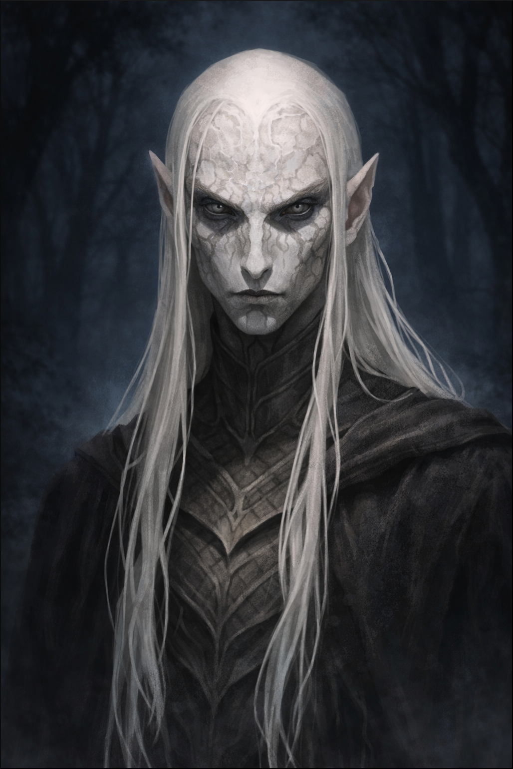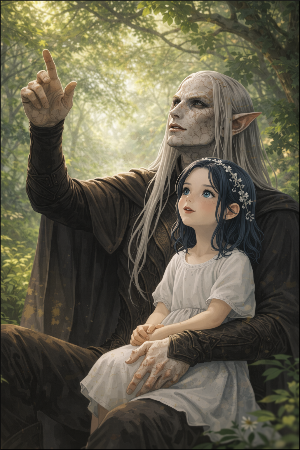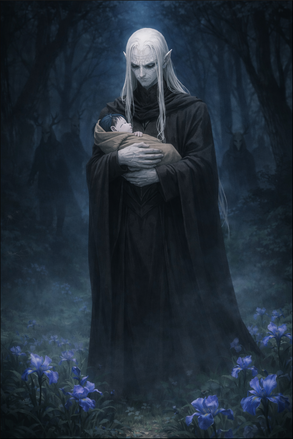 L'elfe pâle baisse les yeux sur les trois éclaireurs, les bras croisés. Il cherche quelque chose du regard. L'un des deux autres, une femme, s'avance alors, soulevant sa cape, il dévoile la forme d'un nouveau né immobile, enroulé dans une de leurs couvertures de voyage.