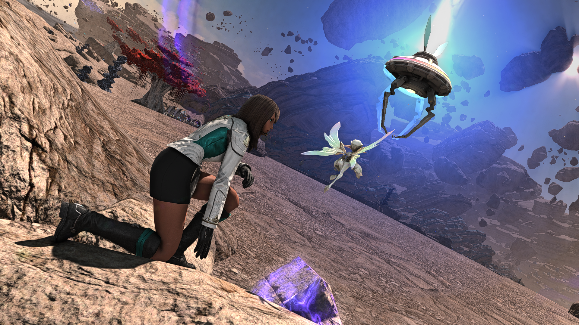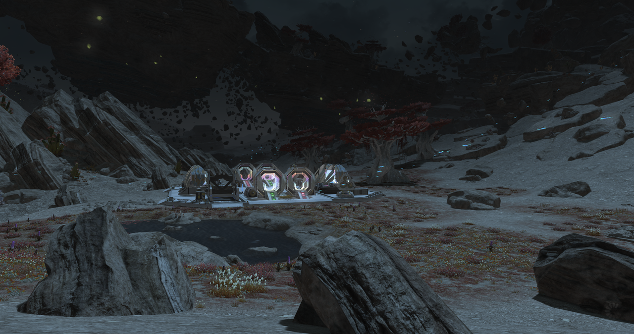 Quelle ne fût pas ma surprise, lors de ma première sortie officielle là-bas, faux et hache en mains !!! Des rochers flottants, une faune complètement différente de celle d'Aetherys, des espèces de robots qui volent, des planchent flottantes pour voyager, des véhicules galactiques, et que sais-je encore ! Heureusement, il y a des cartes et des instructions pour les petits nouveaux dans mon genre afin de trouver les matériaux à récolter... Sinon, je serais complètement perdue !