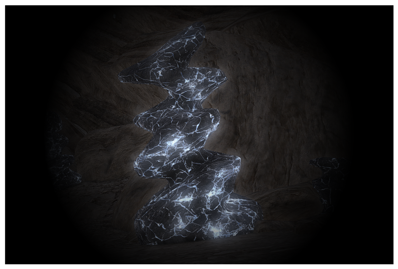 Le second minerais de la zone ressemble à ce que l'on appelle de l'obsidienne, mais son travail diffère d'après les artisans et ingénieur, c'est pour ça qu'on sait que c'est différent. Il se présente en surface comme des tourbillons noirs avec des jolis reflets que j'aime bien. Les géologue cherchent si c'est une formation naturelle, comme les formes cristallines, ou si c'est de la lave locale refroidie dans des galeries sous souterraines qui ont étés mises à nues plus tard. Ils n'ont pas l'air de penser que c'est une création, en tout cas. Côté récolte, c'est très difficile à récolter au premier abord: il faut attaquer la roche par le côté à coup de maillets pour détacher des plaques au bord tranchant. Au début, on fait pleins de fragments pas très utiles, mais quand on commence à savoir ajuster, on obtient de bonnes plaques grosses comme des plateaux. Pour le moment, c'est référé comme "minerais sous-terrain" mais un nom unique serait pas mal. Moi, je dirais Oizydienne, mais ce n'est toujours pas moi qui nomme ici...