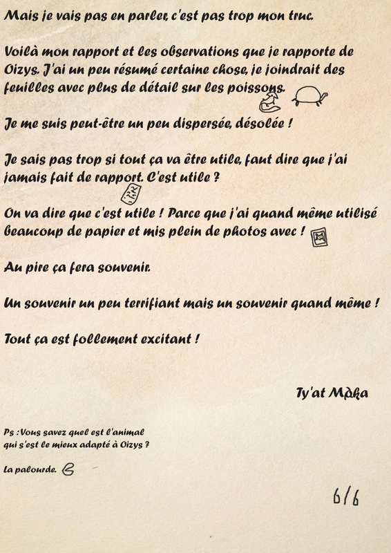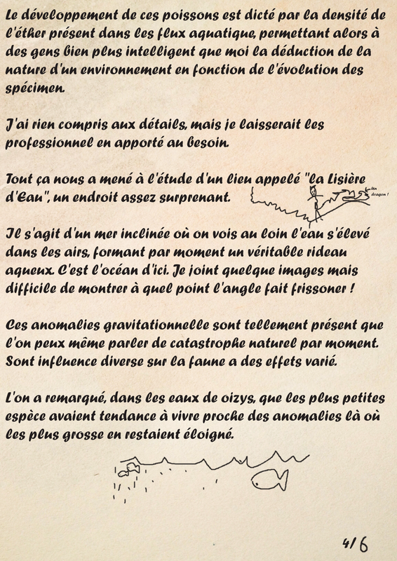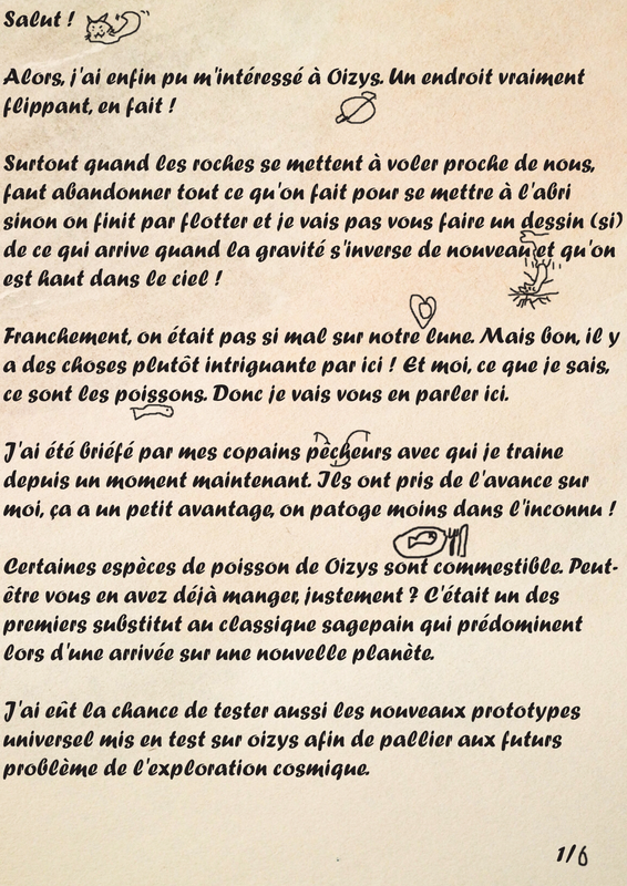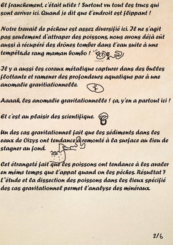 Par où commencer ? On m'a plus d'une fois parlé de la possibilité d'aller sur la Lune, mais j'étais loin d'imaginer que d'autres planètes nous attendaient. Oizys est... en fait, je ne sais pas vraiment comment le dire. Le paysage est à couper le souffle, un véritable autre monde qu'on voudrait explorer de long en large, en découvrir les mystères. Pourtant... Il y a quelque chose de triste là dedans qui me fait rester au campement principal. Tous ces débris, ces roches flottantes, ce sable qui semble danser et qui pourtant est figé dans le temps... J'ignore si cette planète était comme ça à l'origine, mais on croirait qu'un désastre est venu la frapper, comme si un Fléau avait surgit. Cette sphère bleutée enrobée de fragments rocheux nous hurlerait presque qu'elle est une lune mourante. Comment est-ce qu'on met des ima- Ah, voilà.
