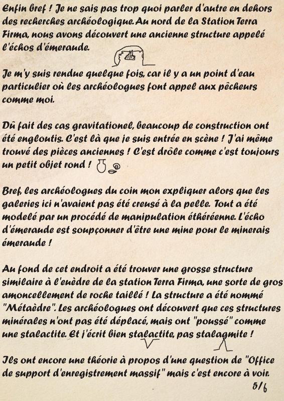 Notre travail ici pourrait bien dépasser, cette fois, la simple prospection de matériaux d'artisanat. On ne peut émettre que des hypothèses mais Searchingway évoque un possible cataclysme à l'origine du dérèglement de la gravité sur cette planète. Que les habitants soient tous morts ou qu'ils aient fui, les fouilles en cours devraient nous permettre de comprendre ce qu'il s'est passé ici.