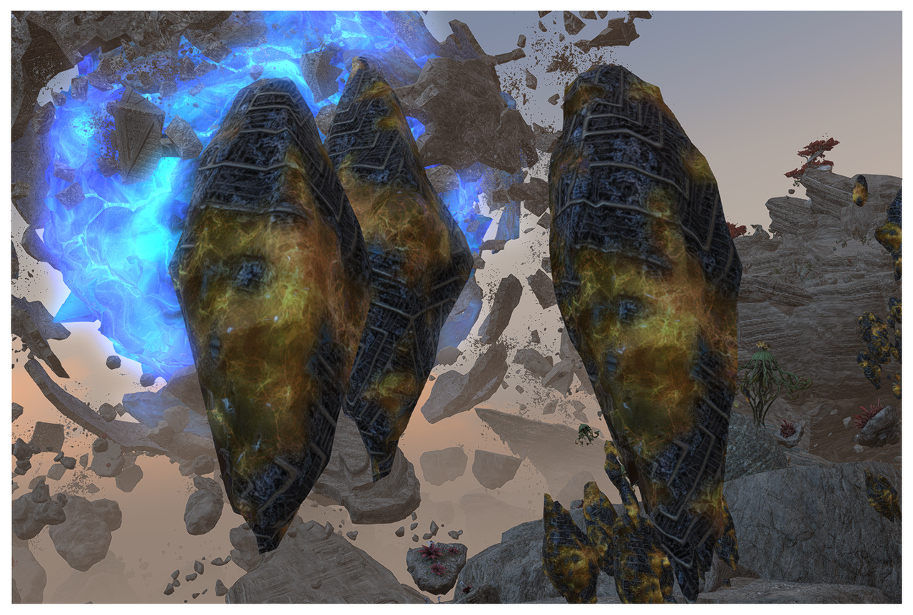 La seconde zone me fait un peu penser à une plage de la Mer de Rubis. On y trouve deux formations naturelles qui m'y font penser: le pseudo-ambre, qui ressemble un peu à de grosses moules volantes, et des formations d'Aluns d'Oizys, qui prennent la forme d'un bigorneau ouvert. Je n'ai aucune idée de comment cela se forme, mais j'ai entendu quelqu'un râler sur l’appellation de "ambre" alors que cela devrait être "réservé à la cristallisation de partie organiques scrogneugneu". (Surtout scrogneugneu, apparemment...)