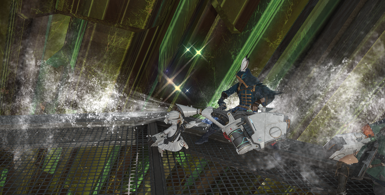 Plus intéressant, en fin de journée, il y a eu un appel général : il y avait besoin de tout le monde pour terminer le chantier de dégagement du cristal géant. On nous a prêter les super cracheur à ether que j'avais vu plus tôt dans la journée, et il fallait nettoyer le cristal des impuretés restantes. Ca se bousculait dans les échafaudage, ca se pressait aux remplisseurs dd cartouches, et ça courrait dans tout les sens. Je n'ai même pas pu prendre une image de Kurusu tsubone au turbin, entre ma taille, les pieds, et son déplacement constant. J'ai réussi à demander à un loporrite de faire une image de mii à la fin, avant de rendre la machine. Le cristal avait l'air irisé pendant les travaux, mais finalement ul est vert et bien intégré à une ruine. Le deblayage du reste a immédiatement commencé, je me demande à quoi ça ressemblera.