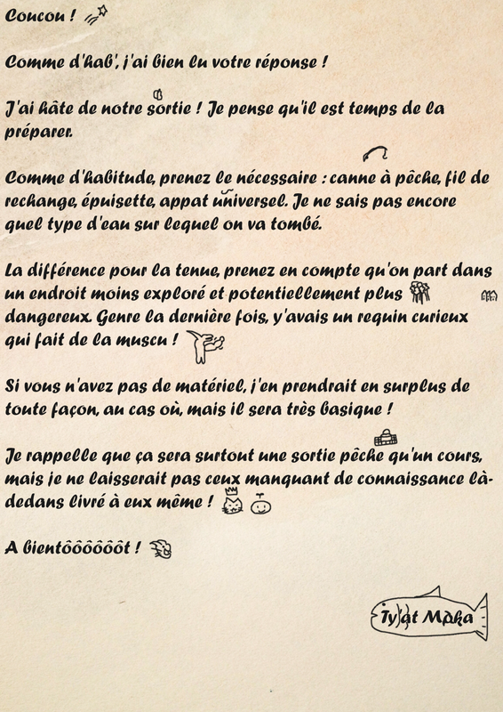 Pour le matériel, j'ai la canne à pêche que m'ont donnée les Loporites sur la lune, et je verrai pour apporter des appâts différents de la Guilde des pêcheurs.
