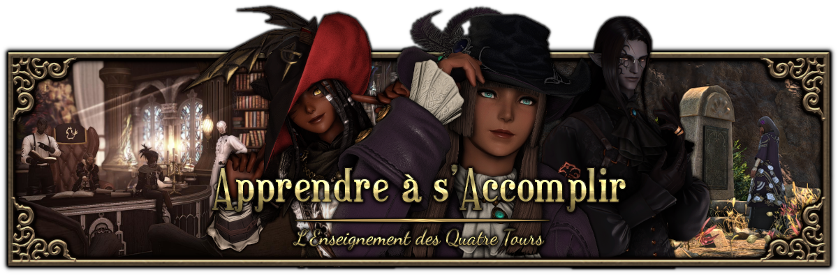 Je décidais de me lancer sur cette quête et de fonder ma propre compagnie afin d'y parvenir. Je n'avais pas vraiment d'amis mais une dot de mariage très convenable dont je pouvais disposer à ma convenance. J'ai ouvert un relais à Shirogane, profitant qu'à l'époque Kugane était une plaque tournante des aventuriers entre l'orient et l'occident. Rapidement, mon entreprise fut victime de son succès. En toute humilité, j'admets ne presque plus me souvenir de qui m'a rejoint en premier. Des orientaux probablement, des employés de service au relais, et d'anciens membres de la compagnie eorzéenne Pluma Noctis que je fréquentait et qui ferma ses portes quelques temps avant mon mariage. Il n'y en a plus aucun aujourd'hui sauf Albynn que j'ai engagé pour servir en salle à l'ouverture. Ce sont tous ceux que j'ai rencontré ensuite, ceux qui sont encore là aujourd'hui, dont je me souviens de nos premières rencontres. En quelques semaines le recrutement s'accéléra et mes effectifs passèrent d'une poignée d'aventuriers intrigués par ce mystère à plus d'une trentaine d'individus sous mes ordres. Ainsi naquit l'Ordre des Quatre Tours. Au plus fort de ce succès, nous avons dépassé les soixante. Parmi eux, certains se sont distingué et se sont même trouvé une ascendance avec les fondateurs, ceux qui donnèrent leurs noms aux quatre tours. Nous avons mené une quête bien longue. Deux années qui prendraient des pages et des pages à raconter. Je les raconterais surement, dans un livre précieux qui sera rangé dans nos archives.